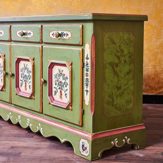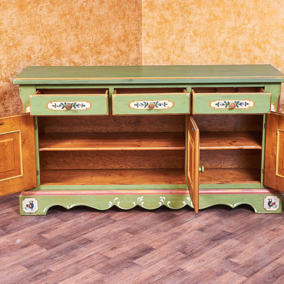 Die Voglauer Kommode aus der Serie “Anno 1700” in der Farbe Altgrün ist aus massivem Fichtenholz gefertigt und mit liebevollen Verzierungen versehen.