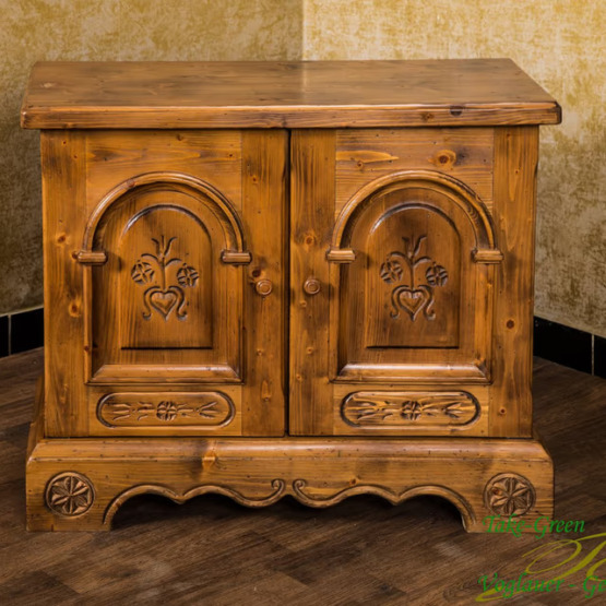 Diese rustikale Kommode aus der Serie “Anno 1600” von Voglauer ist aus massivem Fichtenholz gefertigt und besticht durch ihre liebevollen Verzierungen.