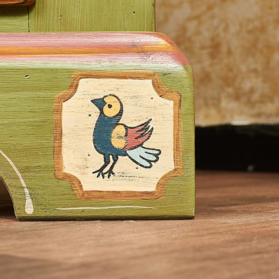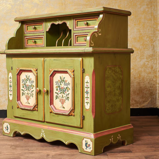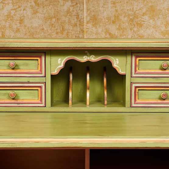 Die handgefertigten Verzierungen verleihen dem Möbelstück eine besondere rustikale Eleganz. Der obere Bereich bietet vier Schubladen, Ablagefächer und eine praktische ausziehbare Schreibtischplatte, sodass Sie genügend Platz haben.
