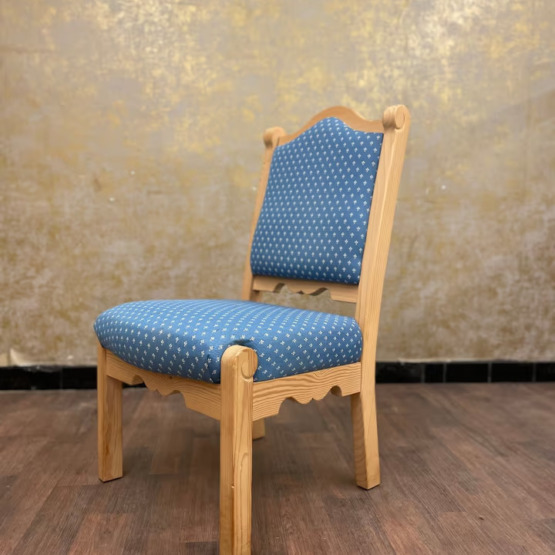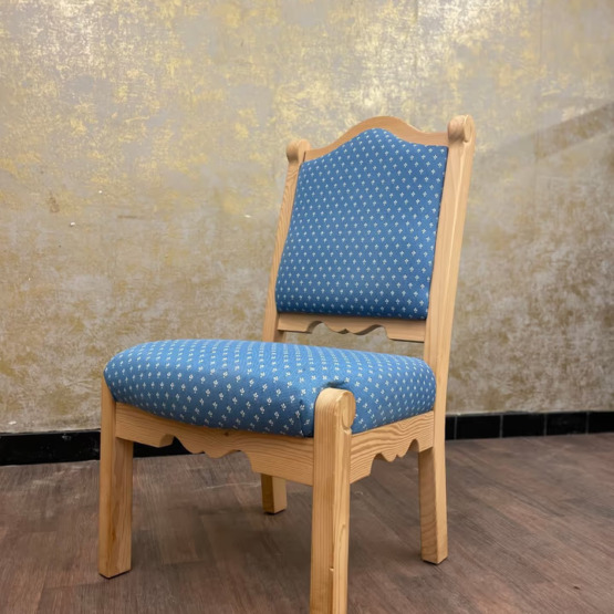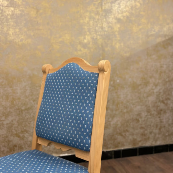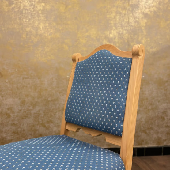 Besonders edel wirkt der blau gehaltene Polsterstoff, der mit einer dezenten weißen Musterung verziert ist – stilvoll, ohne aufdringlich zu sein. Die weiche Polsterung sorgt nicht nur für angenehmen Sitzkomfort, sondern rundet das harmonische Gesamtbild perfekt ab.