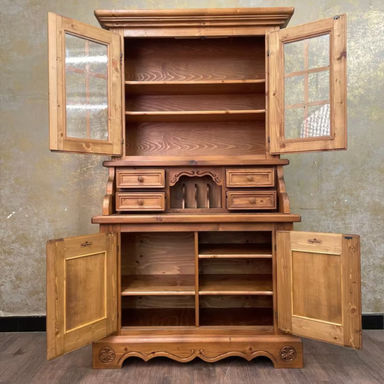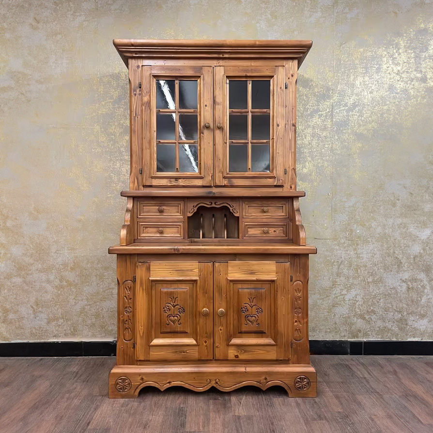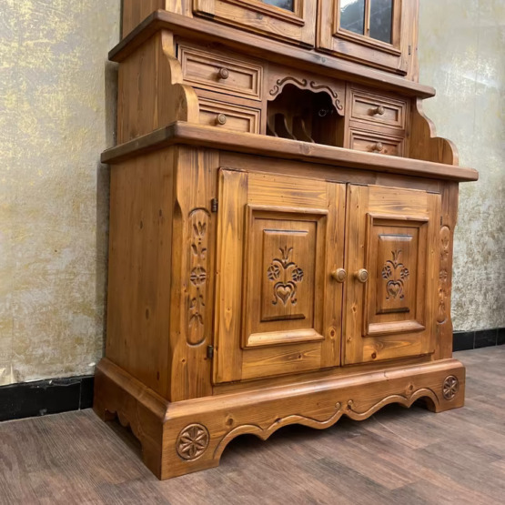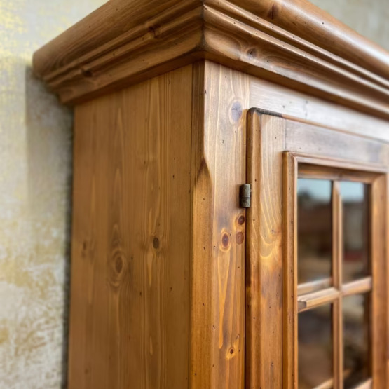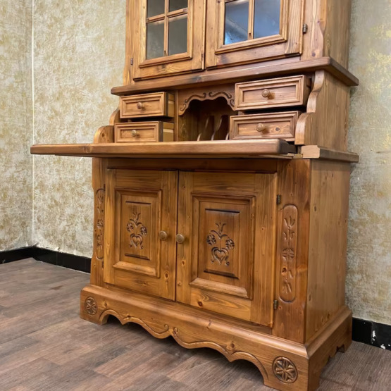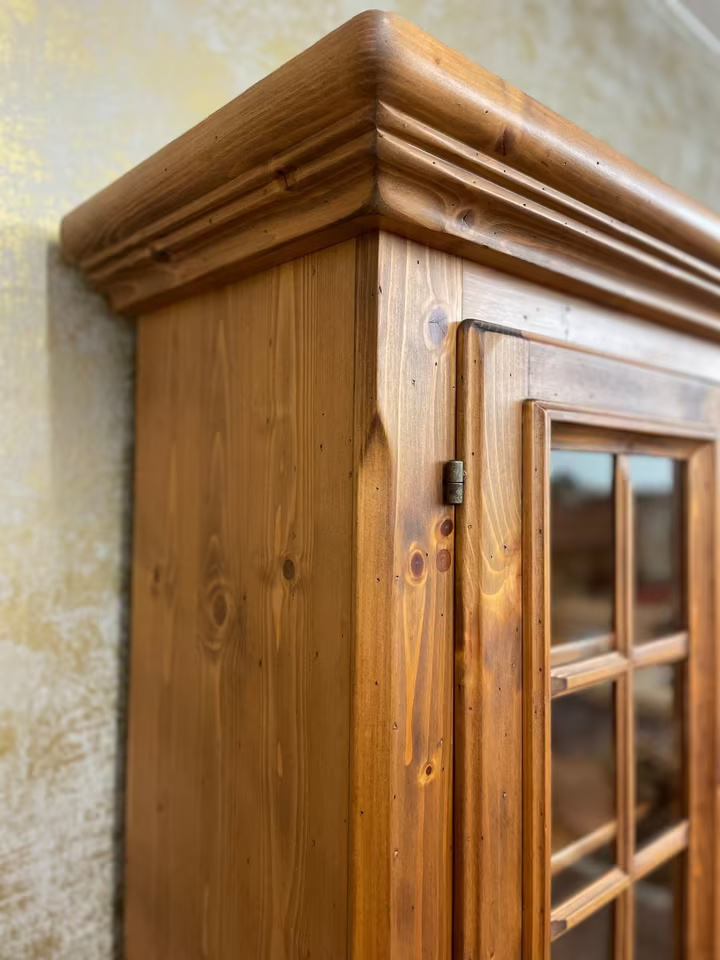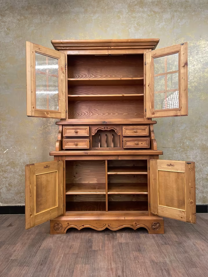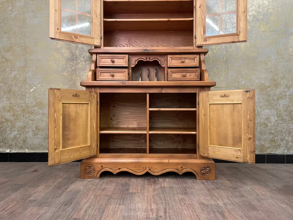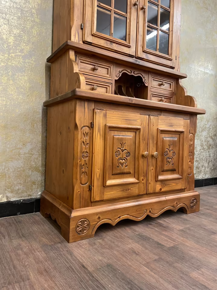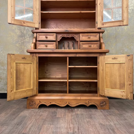Gekrönt wird das Ensemble vom verglasten Vitrinenaufsatz mit zwei Einlegeböden – perfekt zur Präsentation von Gläsern, Porzellan oder Lieblingsstücken. Gefertigt aus massivem Holz, steht dieses Möbel für echte Handwerksqualität im Herzen des Alpenlandes.