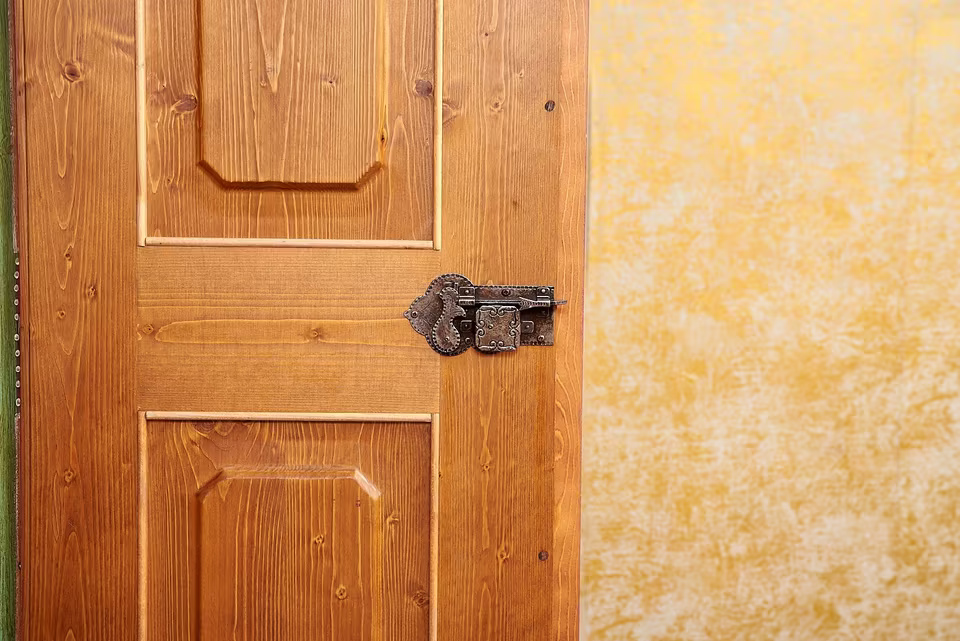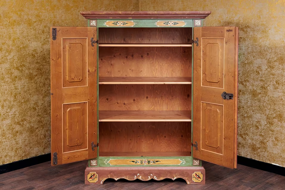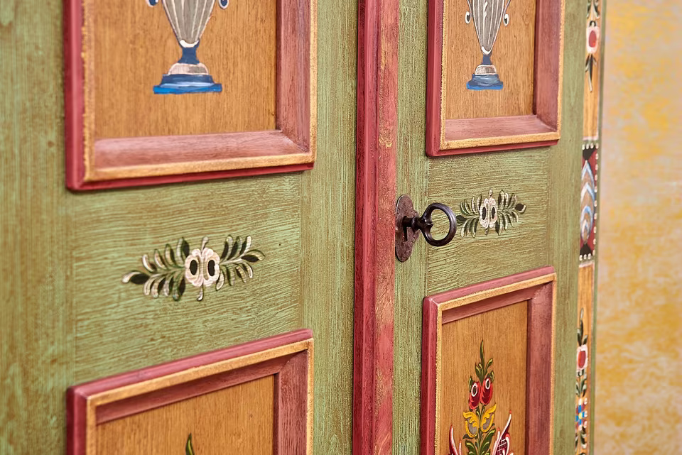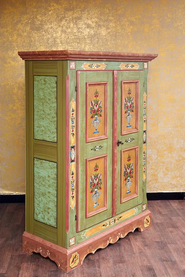 Das warme Grün, kombiniert mit Rot- und Ockertönen, hebt die handgemalten Ornamente kunstvoll hervor. Im Inneren bietet der Schrank großzügigen Stauraum mit stabilen Einlegeböden – ideal für Kleidung, Wäsche oder Geschirr.