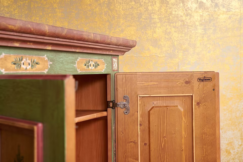 Ein wahres Schmuckstück alpenländischer Handwerkskunst: Dieser originale Voglauer Bauernschrank besticht durch seine aufwendige Bemalung in kräftigen Farben. Die floralen Motive mit Blumenvasen auf den Türen verleihen ihm eine festliche Ausstrahlung, die seit Generationen in traditionellen Bauernstuben geschätzt wird.