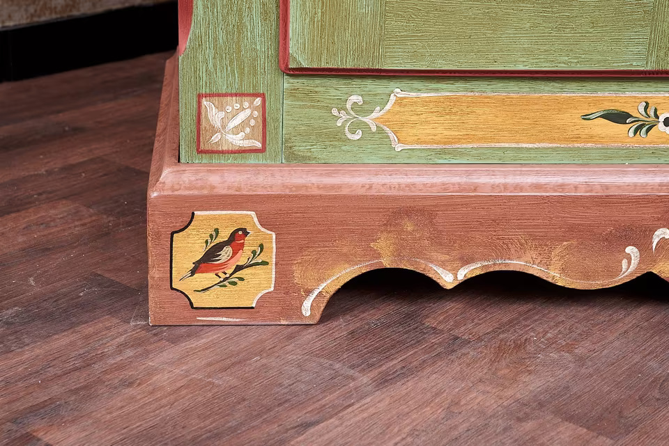 Jedes Detail, von den geschwungenen Sockelleisten bis hin zu den bemalten Zierfeldern, macht ihn zu einem einzigartigen Möbelstück, das Wohnräume mit Heimatgefühl und Authentizität erfüllt.