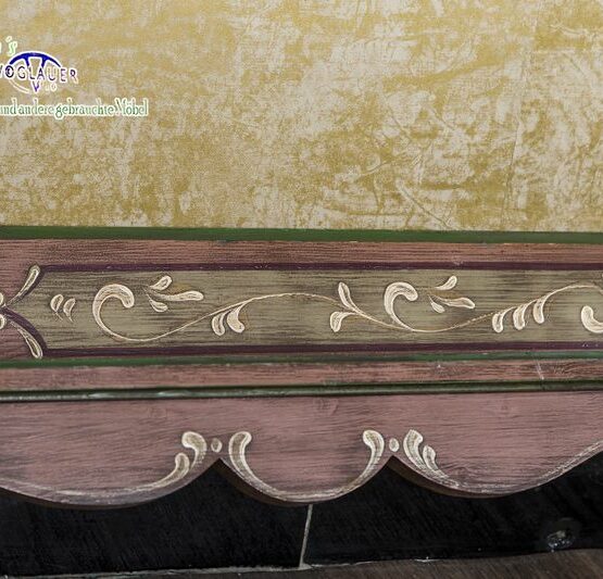 Sein zartes Altrosa wirkt wie von der Zeit geküsst, während goldene Rankenornamente der schlichten Eleganz ein feines Krönchen aufsetzen. Die geschwungenen Formen an der Unterkante verleihen dem Regal eine fast tänzerische Leichtigkeit.